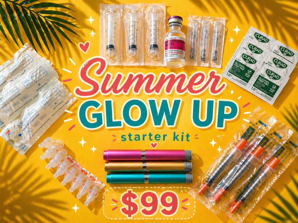 Three V2 reusable injection pens, one 30ml bottle of Hospira BAC water, insulin syringes, three luer lock syringes, three luer lock compatible needles, three pen vials, and six alcohol swabs — everything you need for your first three setups and to get your Summer Glow Up game on!